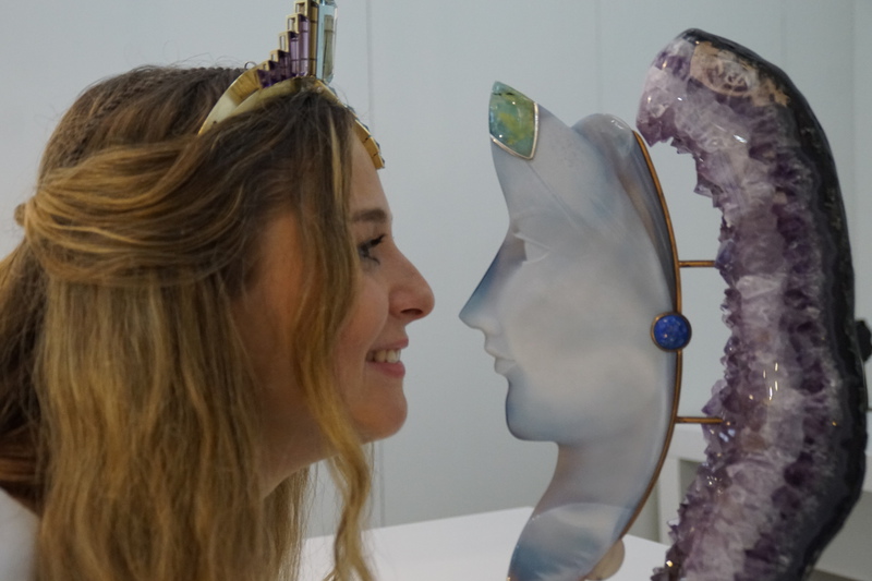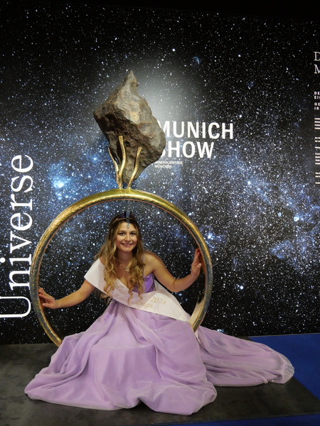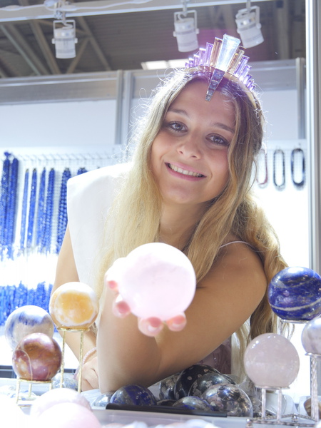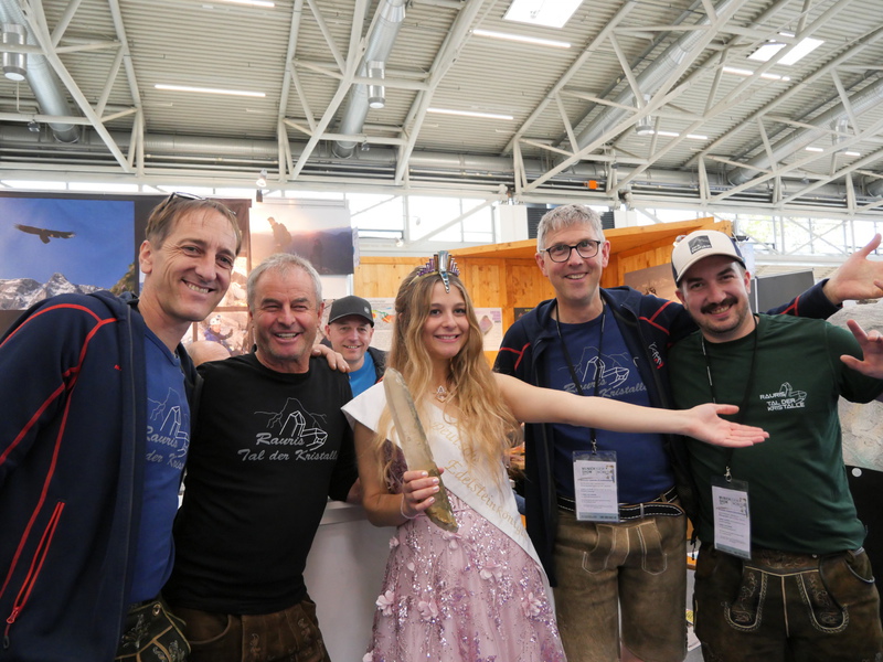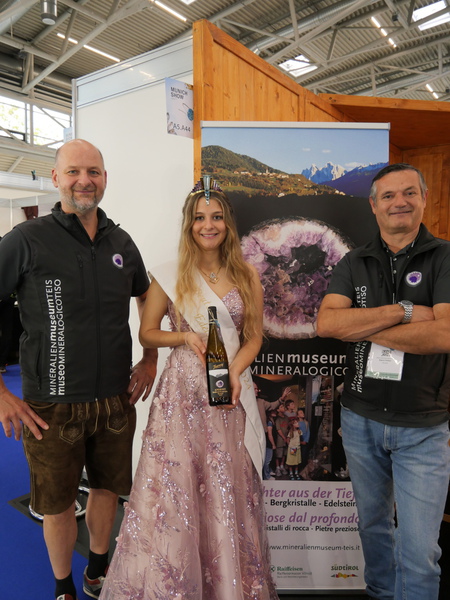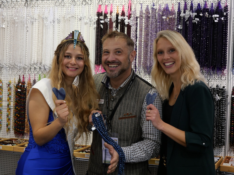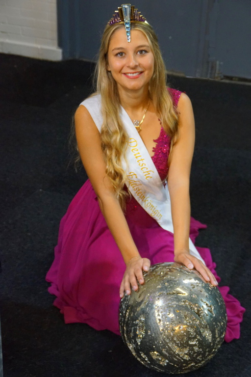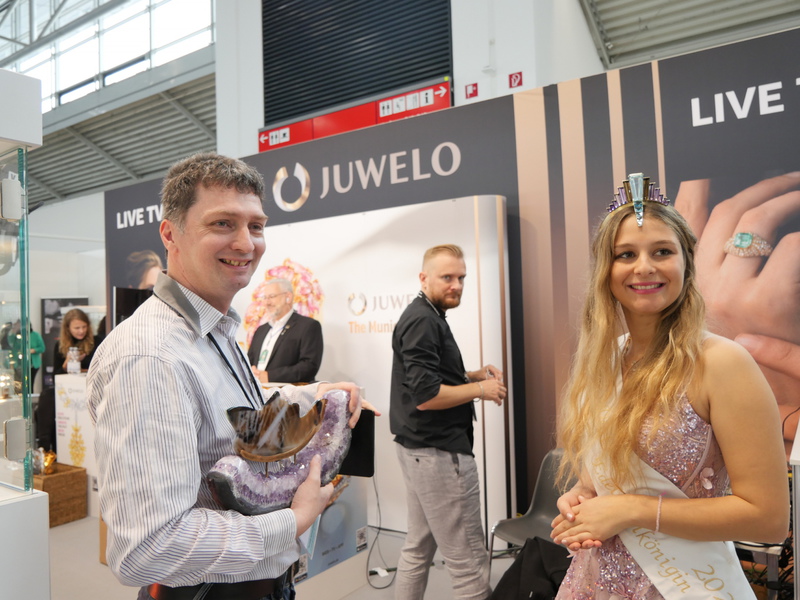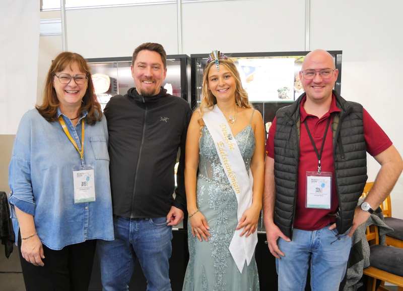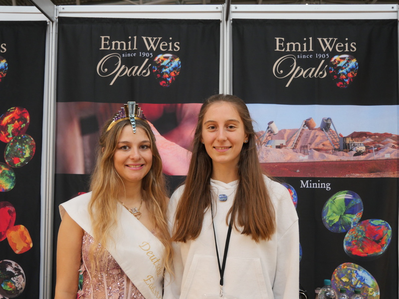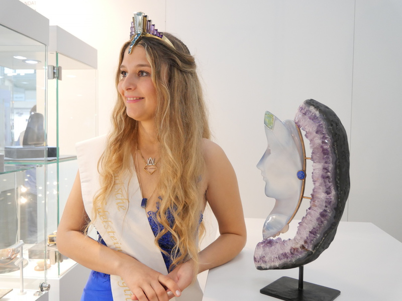 Die hiesigen Händler, sei es edelste Preziosen- oder auch Rohsteinanbieter sind nicht voll zufrieden mit der Messe. „Die GemWorld war schon vorher nicht der beste Verkaufsplatz, aber es werden wertvolle Kontakte zu potentiellen Neukunden geknüpft“, war der Tenor der Händler aus der Edelsteinregion. „Es müssen nicht viele Kunden kommen, sondern die richtigen“, ist eine andere Aussage, die aber absolut zutreffend ist. Solvente Kunden können hohe Beträge investieren und so hat sich mit einem, aber großkalibrigen Geschäft der Messeauftritt gelohnt. Uneingeschränkte Zufriedenheit und Freude teilten sich alle hiesigen Aussteller, als die Vertreter der Deutschen Edelsteinstraße zu Besuch kamen. Für viele war es das erste Zusammentreffen mit der neuen Deutschen Edelsteinkönigin, Vivian Heidrich, welche die Vorstandsmitglieder des Fördervereins Deutsche Edelsteinstraße, Bettina Reiter und Leonhard Stibitz im Gefolge hatte. Die 24. Deutsche Edelsteinkönigin brauchte nicht lange, bis sie alle in ihren Bann gezogen hatte. Ihre Begeisterung ist authentisch und ihre Ausstrahlung bewundernswert. Doch Obacht! Wer die blond gelockte Schönheit auf ihr Äußeres reduziert wird spätestens bei der Beantwortung der Fachfragen auf die Fachkompetenz der Majestät aufmerksam. Ihre Antworten zu Edelsteinen und Fossilien haben Referenzcharakter.