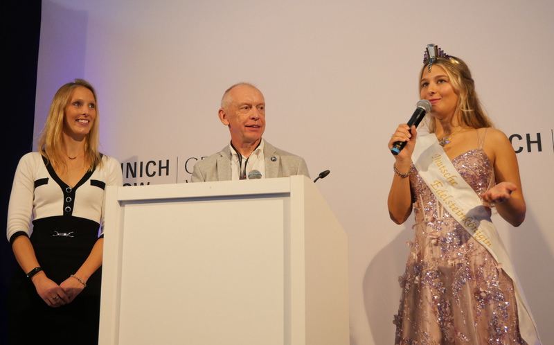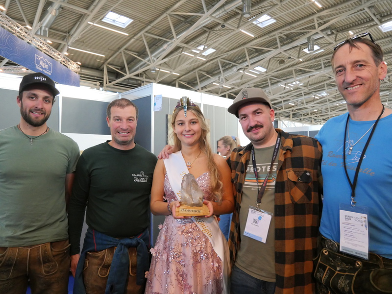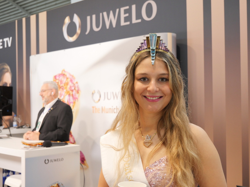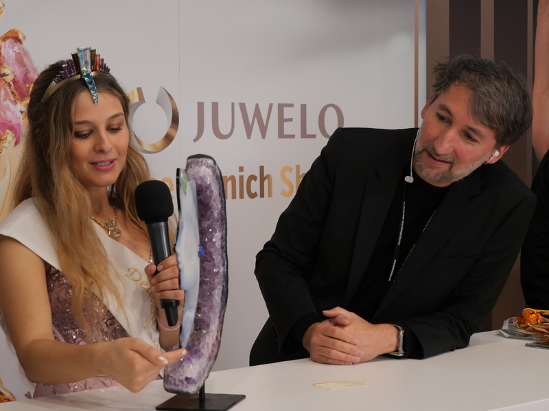 Bisweilen kommt die Majestät keine fünf Meter weit, ohne auf eine Selfie angesprochen zu werden. Auch Stefanie Mändlein, Exhibition Direktor INHORGENTA, freute sich über den Besuch der Abordnung. Bereits jetzt wird überlegt, wie man im kommenden Jahr die Edelsteinkönigin mehr einbinden kann, zum Beispiel bei der Übergabe des Awards. Diese abendliche Gala in der Olympiahalle ist eine ganz exklusive Veranstaltung, bei der neben einem herausragenden Showprogramm Auszeichnungen in neun Kategorien übergeben werden. Wie so oft fällt auch hier der Name Idar-Oberstein des Öfteren. Alexander Arnoldi (Arnoldi International) durfte den Preis für die Kategorie " Gemstone Design of the Year" entgegennehmen. Die atemberaubende Kreation "Flammenwirbel" aus 190 filigran geschliffenen Mandarin-Granaten konnte die international hochrangig besetzte Jury nachhaltig beeindrucken. Die Gewinnerin des Awards "Design of the Year" erhielt neben der Trophäe von Nicole Ripp den von der Firma Groh und Ripp gesponserten Preis in Form eines hochwertigen 10 Karat schweren Turmalins im Ovalschliff. Die Gewinnerin freue sich offenkundig darüber fast mehr, als über die eigentliche Auszeichnung. Treffpunkt war oft der Stand der Deutschen Gemmologischen Gesellschaft und des Bundesverbandes Edelstein- und Diamantindustrie, an dem rege Frequenz herrschte. Hier wurde auch Werbung gemacht für den kommenden Schmuck- und Edelsteinpreis und über die Berufe rund um das Edelsteinhandwerk informiert. Für die Vertreter der Deutschen Edelsteinstraße gab es ein herzliches Wiedersehen mit Julian Schmitz-Avila, Händler bei der Fernsehsendung „Bares für Rares“. Natürlich wurden auch neue Kontakte geknüpft, wie zum Beispiel mit Gaetano Cavalieri, dem Präsident der World Jewellery Confederation, den Dieter Hahn herstellte.