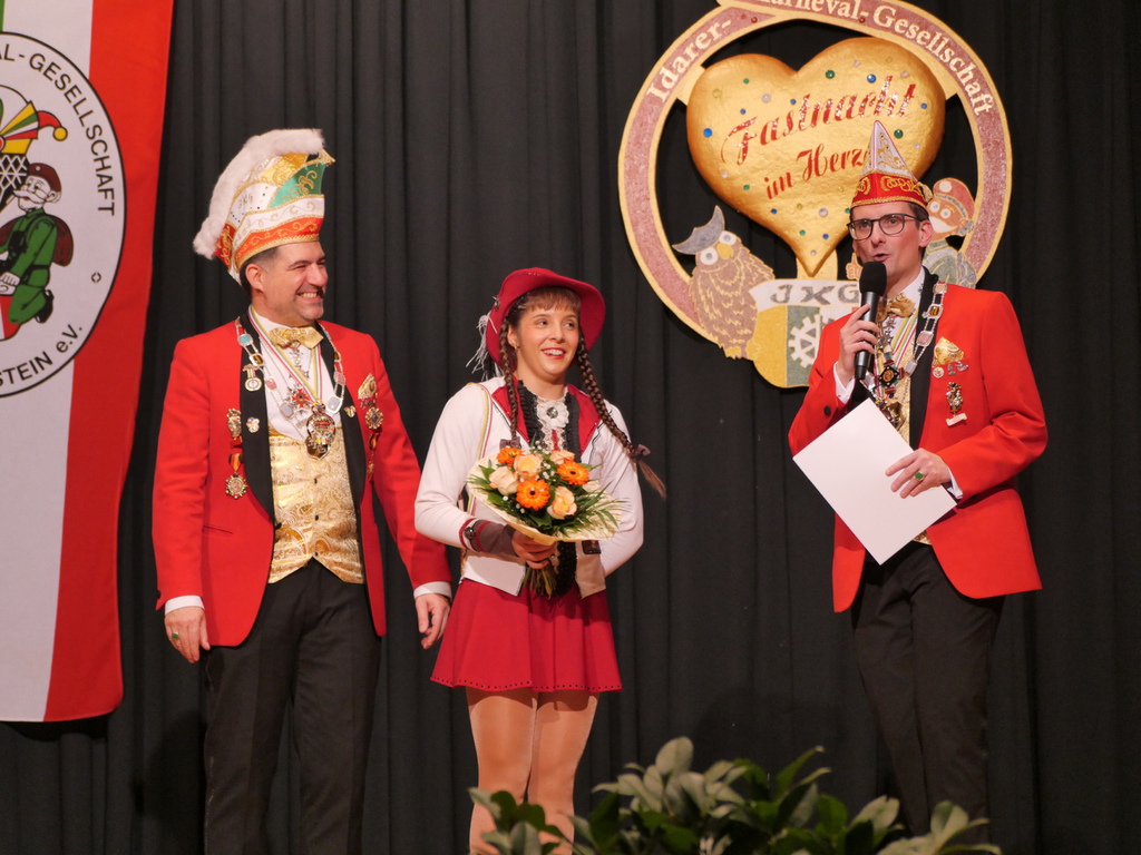 Sitzungspräsident Daniel Marx begrüßte die Anwesenden, Sponsoren und Ehrengäste. Allen voran unsere Deutsche Edelsteinkönigin, Vivian Heidrich, die während ihrer Amtszeit das Zepter der damaligen IKG-Edelsteinkönigin aus dem Jahr 1949 tragen darf. Es erwartete uns ein äußerst kurzweiliger Abend mit tollen Büttenreden und Tanzvorführungen, die ihresgleichen suchten. Zu Gast war auch die Veitsrodter Karnevalsprinzessin Celine I. mit Prinz Janus I.