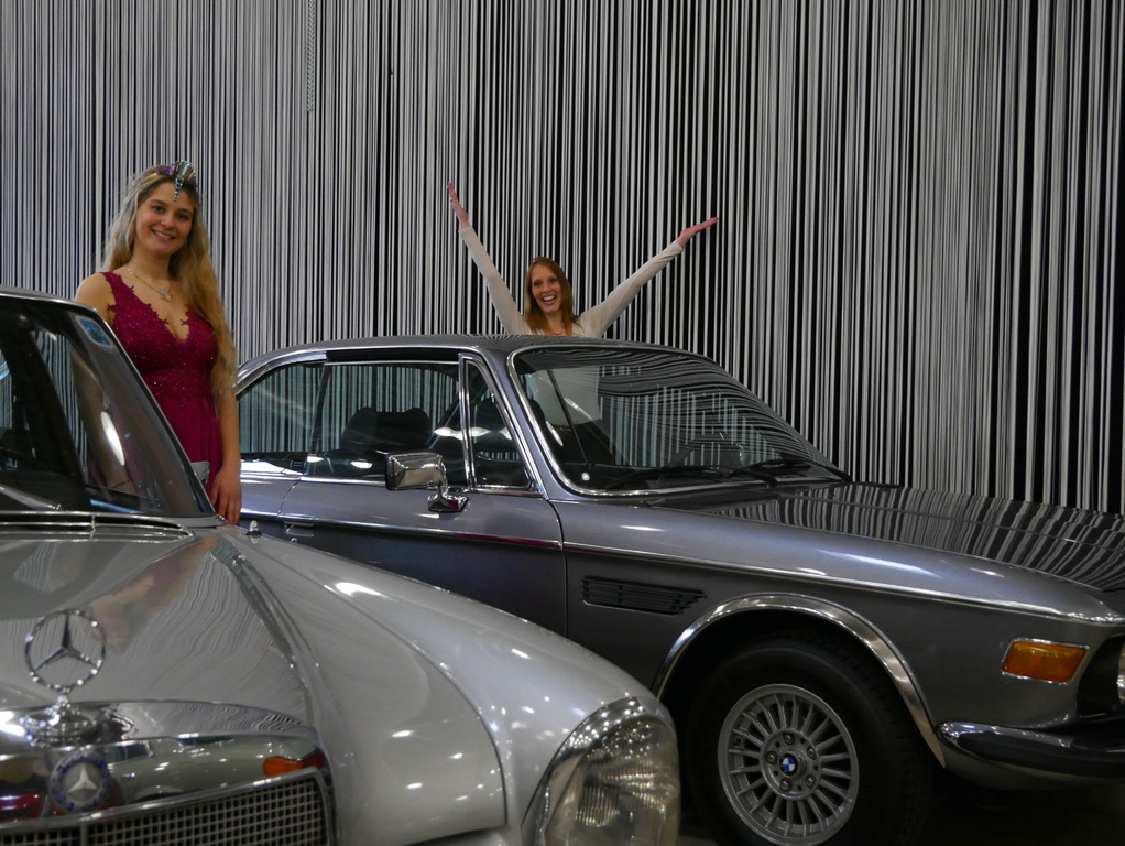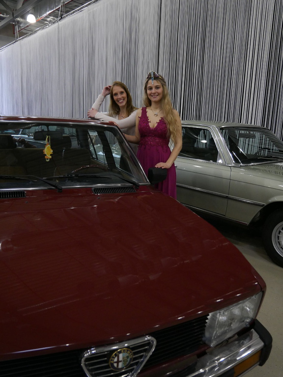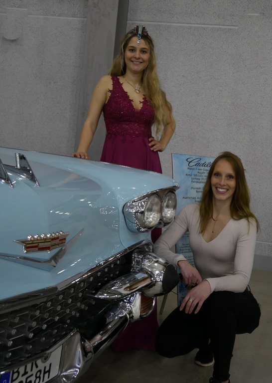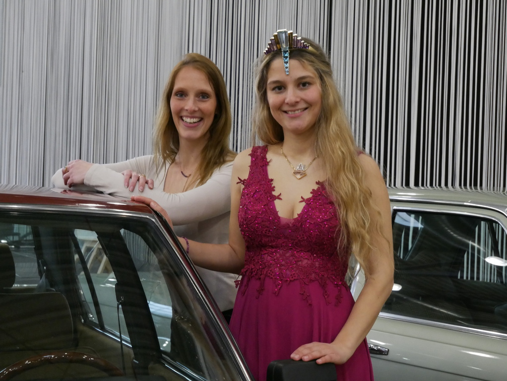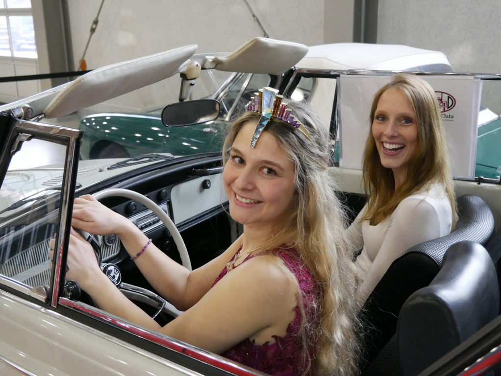Edelsteinkönigin Vivian Heidrich, die am Samstag mit Messechef Mirko Arend, Michael Frey (IOAM) und Leo Stibitz die Messe eröffnete, fand im hubraumstarken Pontiac Grandville Cabriolet ihren Lieblingsplatz. In ihrer Eröffnungsrede, sie kam gerade von der Mineralienbörse Niederwörresbach, verglich sie treffend die Ausstellungen. Viel Interessantes und Augenfälliges gebe es zu entdecken. Neben vielen Neufahrzeugen und Motorrädern gab es viele interessante Oldtimer. Der Liebling unserer Königin war aber der Wackel-Dackel von unserem Schatzmeister Leo Stibitz, der seinen Alfa Romeo Oldtimer ausstellte und auch die Moderation des historischen Automobilgutes machte.