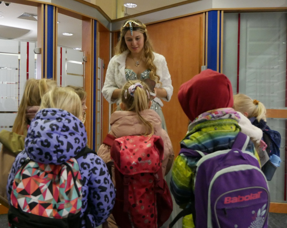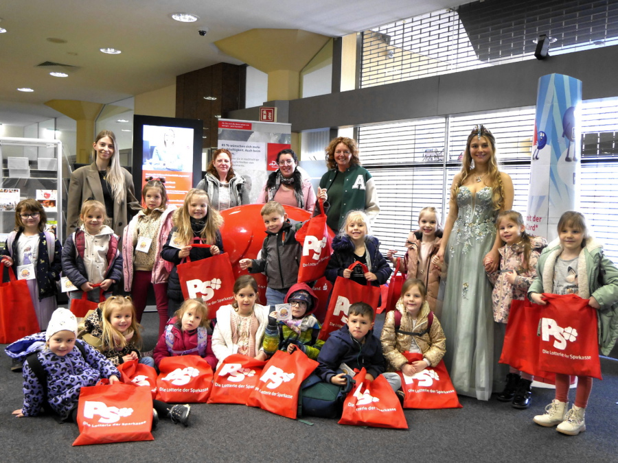 Die Kinder der KiTa Stipshausen waren begeistert. Die hatte angefragt, ob sie nicht mal die Edelsteinkönigin treffen könnten. Irgendwann wollten sie auch noch in die Sparkasse. Die schauten nicht schlecht, als unser Vorsitzender Leo sagte, dass man das vereinen könne. So kamen die 16 Kleinen nach Oberstein in die KSK Hauptstelle, wo Leo zeigte, wie man Automaten bedient. Highlight war der Besuch im Tresor. Natürlich wollten sie auch von unserer Königin viel wissen. Insbesondere die Mädchen waren ao begeistert, dass unser Förderverein in ca. 13 Jahren keine Sorgen hat Bewerberinnen für das majestätische Amt zu finden. Mit von der Partie war auf KSK Seite auch unsere Schatzmeisterin Celine Roes.