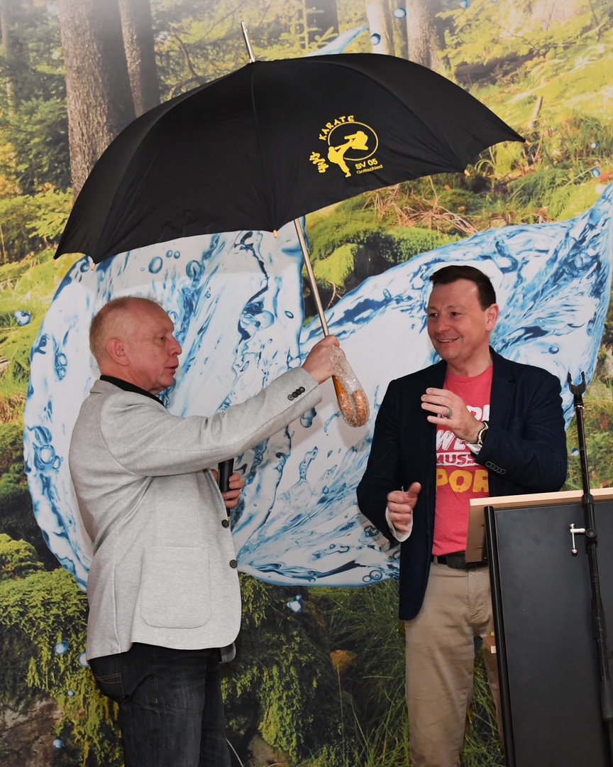 Im Rahmen der Jugendsportlerehrung überreichte unser Vorsitzender Leonhard Stibitz dem scheidenden Messechef Mirko Arend für sein neues Arbeitsumfeld im hohen Norden (Husum) einen Schirm und ein Poloshirt. Der Schirm wegen dem dort zu erwartenden Wetter, das Shirt mit dem Logo der Deutschen Edelsteinstraße.