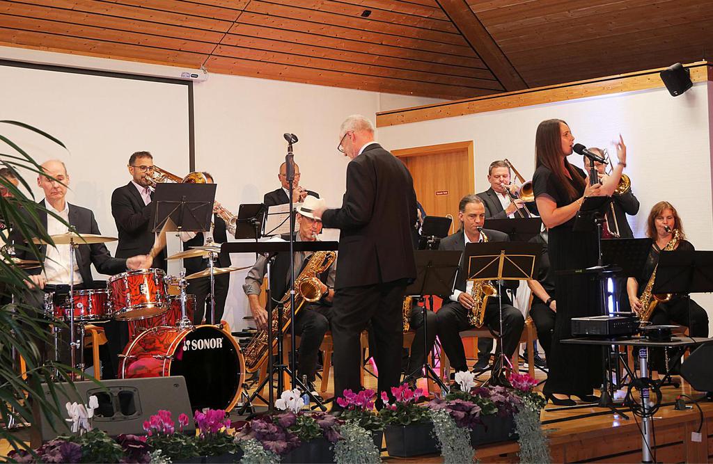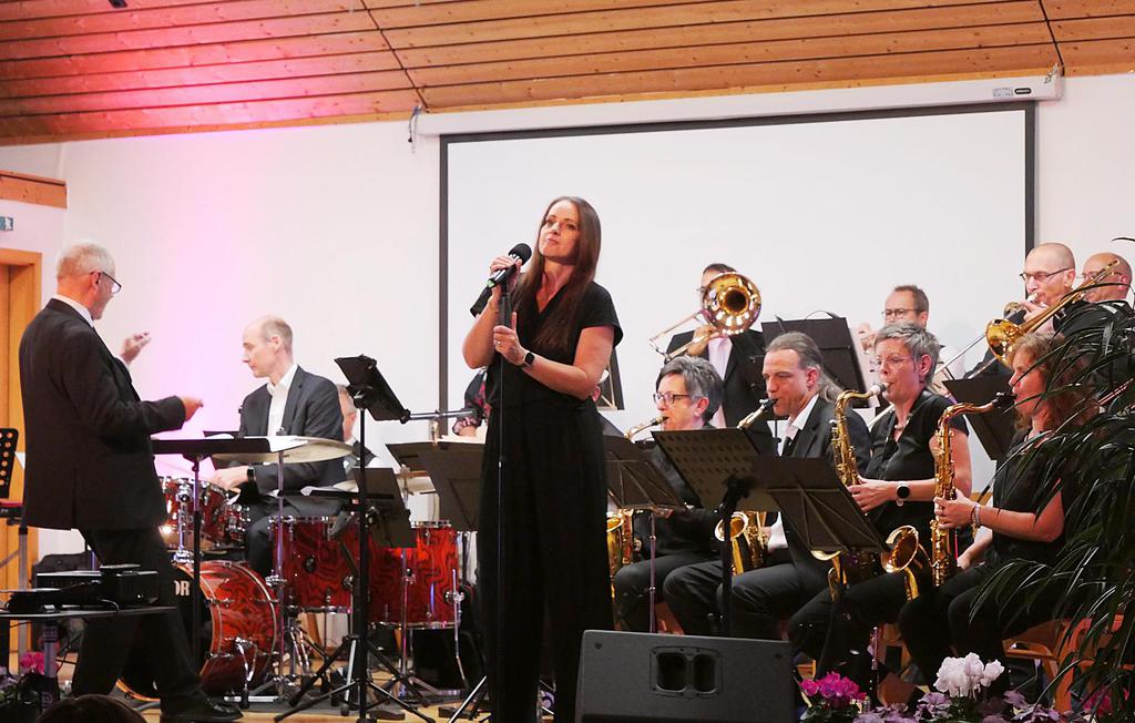 Der wurden nun fortgesetzt durch die Bigband mit Unterstützung von Sängerin Ully Mathias, die einmal mehr ihre Zuhörer faszinierte. Ihre Intonation von „Sky Fall“ (James Bond Melodie) war bravourös, wie ihre gesamte stimmliche Leistung. Doch bevor die neue Königin im übertragenen Sinn aus dem Himmel fiel, sollte zunächst Cécile Elligsen verabschiedet werden.