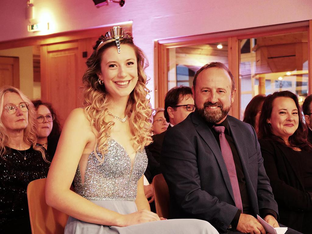 Nun war es an der Zeit für Sissi, die 23. ihre Krone abzulegen. Zuvor hielt Rouven Voigt eine emotionale und würdige Laudatio und übergab ein Geschenk an Cécile. Ein 3D Bilderrahmen, symbolisch gefüllt mit ihren Hobbys: ihr Hund, ihr Pferd, ihre Bienen, eine Ärztinnen-Puppe in Anspielung auf ihr zukünftiges Berufsfeld und von allem ein Amulett mit Ihrem Konterfei. Das hatte Andrea Sohne kunstvoll erschaffen und Esther Ackermann perfekt gefasst und mit einer schmuckvollen Kette versehen.