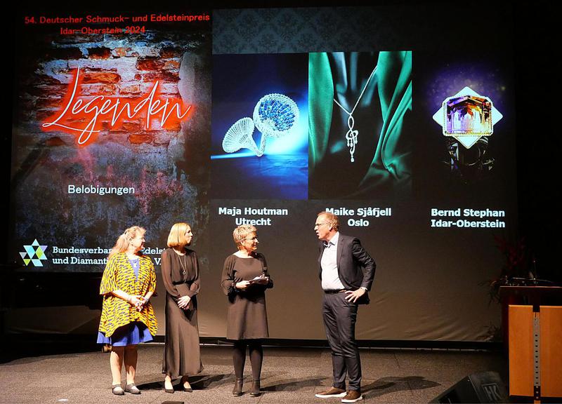 An exponierter Stelle in der Halle der Schmuckaussteller fand sich die Vertretung der BBS Idar-Oberstein/Harald-Fissler-Schule. Am ansprechenden Messestand informierten die engagierten Fachlehrer Klaus Schäfer und Wolf-Gerd Frey über die deutschlandweit ausschließlich in Idar-Oberstein zu erlernenden Edelsteinberufe und die entsprechenden Ausbildungsgänge an der BBS. Beim bereits erwähnten Young Designers Corner Schmuckwettbewerbs 2023 wurde ein in Idar-Oberstein ausgebildeter junger Mann prämiert. Niklas Vaitl beeindruckte mit seiner Collierschöpfung “Bagheera –Majesty of the Dungle” die Jury. Auch die BBS hielt im Rahmen des Forumsprogramms informative Fachvorträge. Dabei wurden Schäfer und Frey, beides selbst diplomierte Designer, von zwei jungen Damen unterstützt, die keinen Zweifel daran ließen, dass sie für ihren Beruf brannten. Maria Mörling und Ronja Pieroth sind Auszubildende Edelsteinschleifer im zweiten bzw. dritten Lehrjahr. Mörling, aus Norddeutschland kommend, sah in der SWR Fernsehsendung „Handwerkskunst – Wie man Edelsteine schleift“, eine Folge, die sie nachhaltig faszinierte. In der Folge verlegte sie ihren Lebensmittelpunkt nach Idar-Oberstein und wird bei der Arnoldi International ausgebildet. Das ist genau die Firma, die auch in der Fernsehsendung die Erklärungen zur hohen Kunst des Schleifens lieferte. Für Ronja Pieroth aus Schmidthachenbach war es eine Berufung, die neben ihrer Liebe zu Edelsteinen noch die Talente als begabte Zeichnerin und die benötigte Fingerfertigkeit mitbrachte. Die jungen Damen waren so überzeugend, dass branchenfremde Zuhörer ihre eigene Berufswahl noch einmal überdachten.
